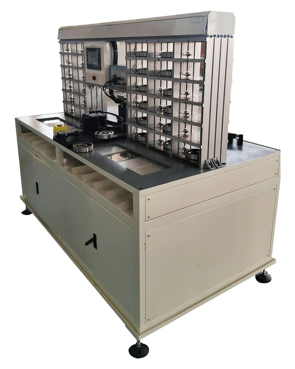 轴承装配设备系列设备概述 MM-DHTJ-04 型半自动测量分选合套机主要用于大型深沟球轴承的配圈选球合套等组装工序,设备结构简单,调整方便,高效稳定,是取代手工装配的选择! 功能描述 1、内/外圈人工放入测量工位. 2、内/外圈自动测量, KEYENCE测量仪器, 仪器精度: 0.1m, 重复测量误差: ±1m. 3、根据触摸屏设定的游隙值﹐计算选取钢球,钢球库自动打开对应型号的钢球,避免装错球。 4、钢球组数7组, 钢球尺寸触摸屏可设定. 5、人工取球合套 设备图片